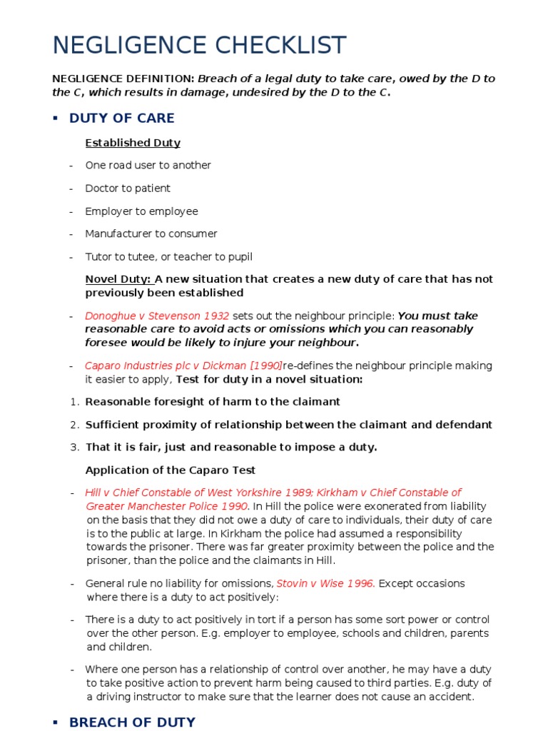 Negligence Checklist PDF Negligence Causation (Law)